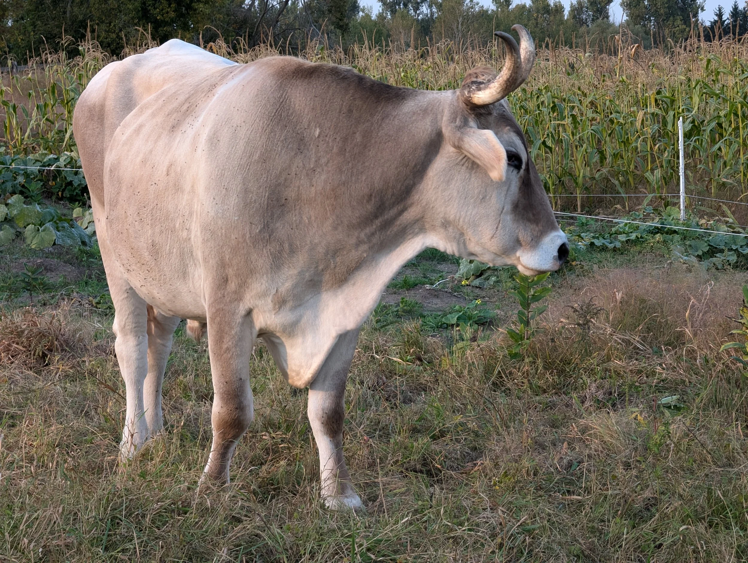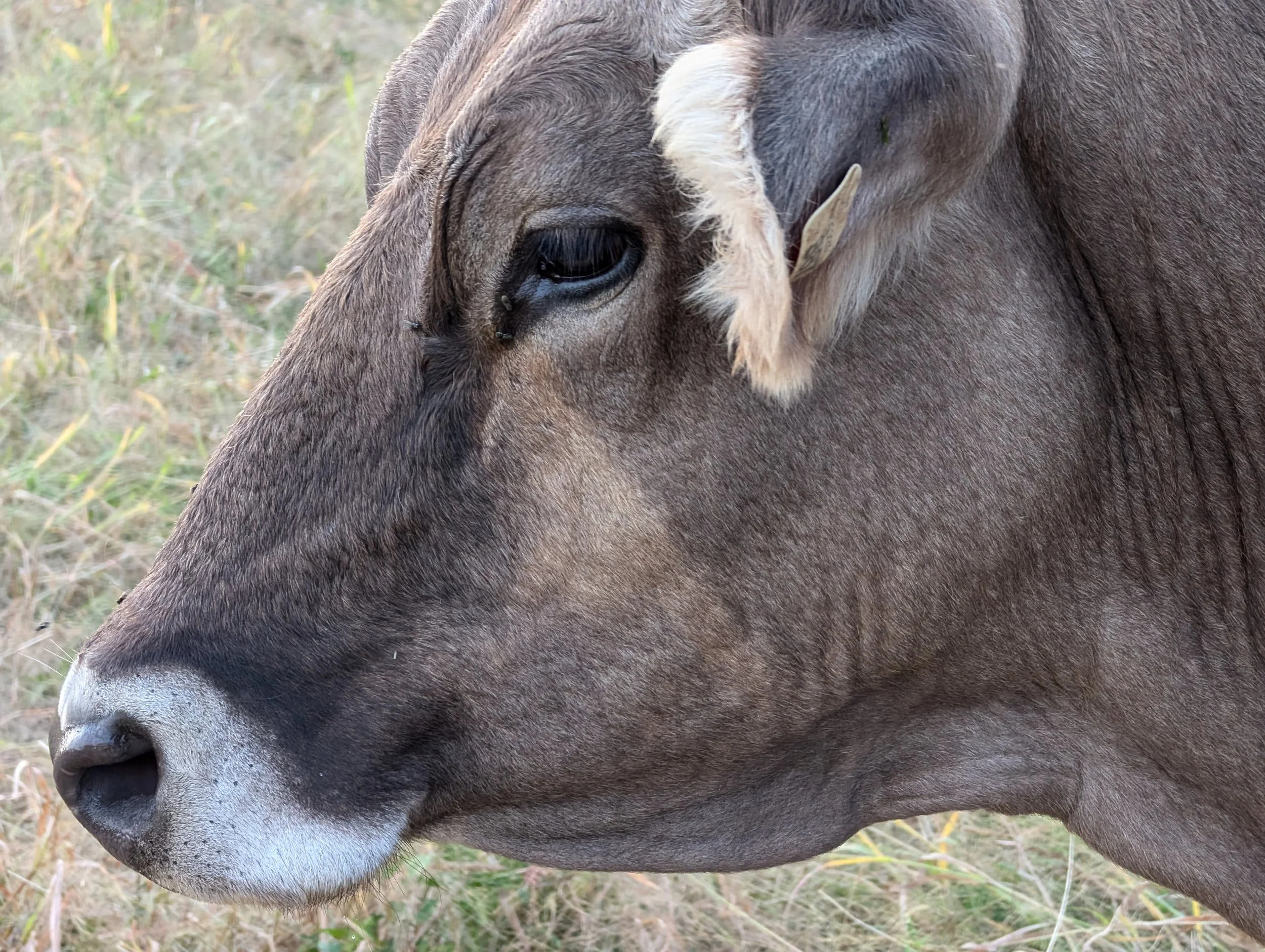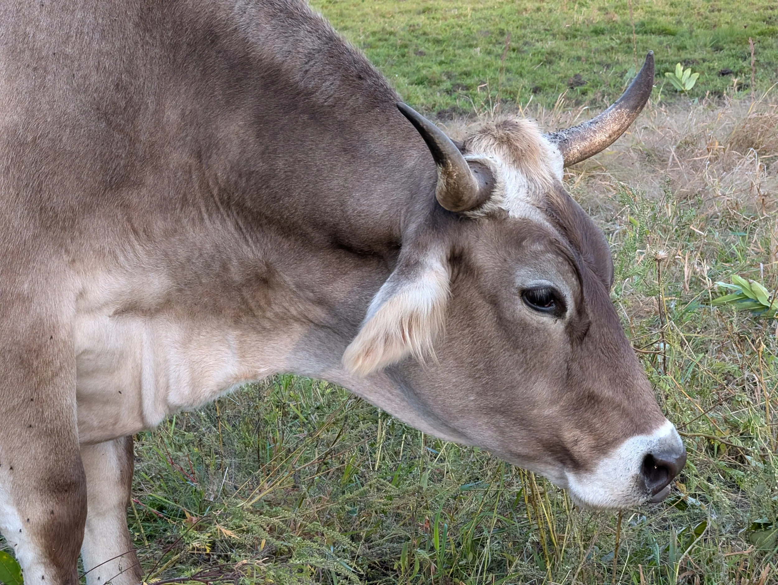 Perhaps a distant cousin of Kṛṣṇa and Balarām, Chintamani followed them from the same farm to ours in the Spring of 2023. It took her time to find her place in the herd and transition to the grass based diet here. Now she is a full-fledged herd member. She is so soft and gentle and her gaze will melt your heart!