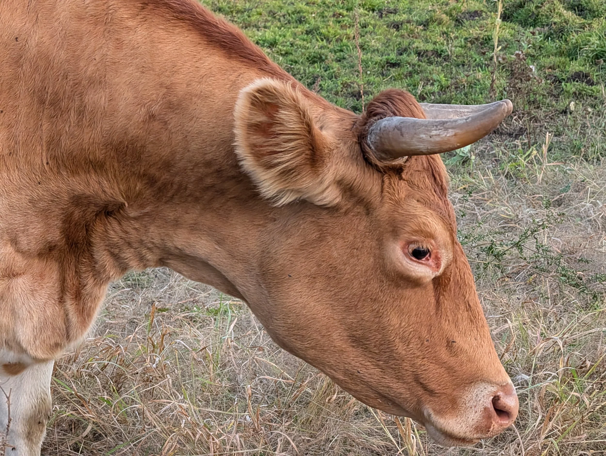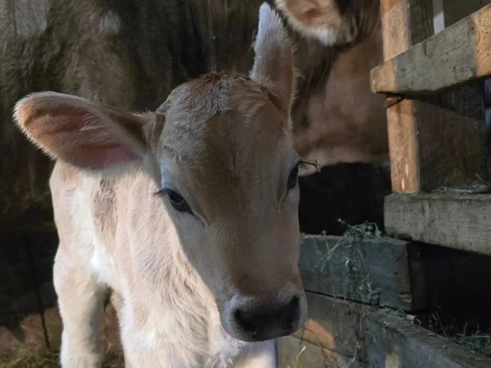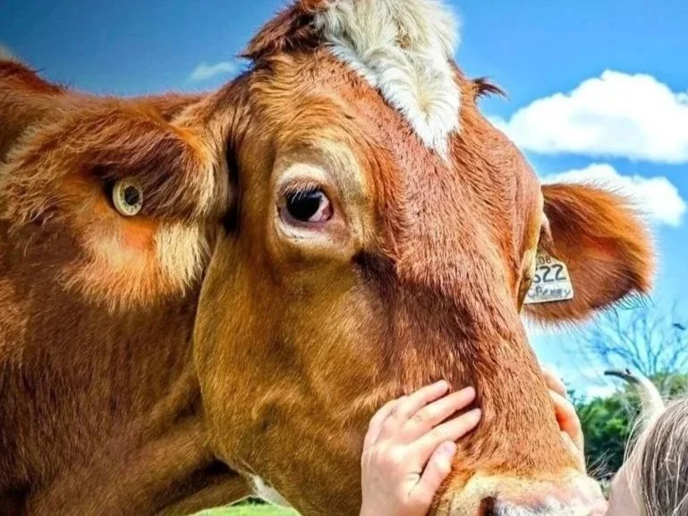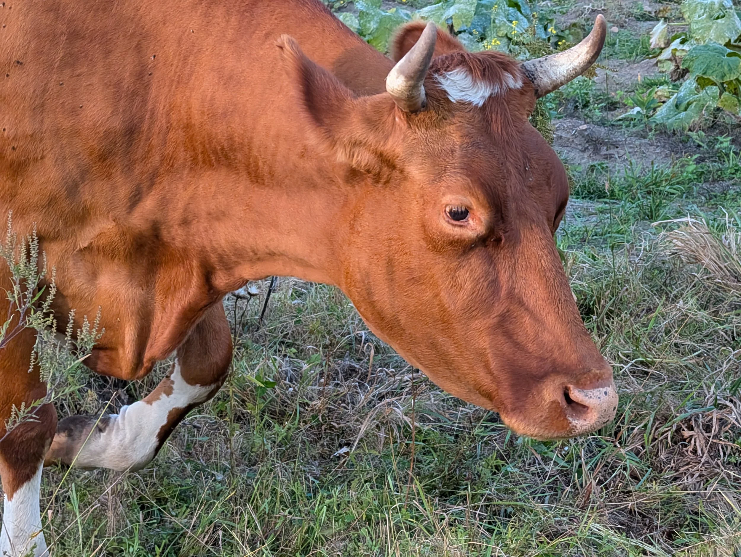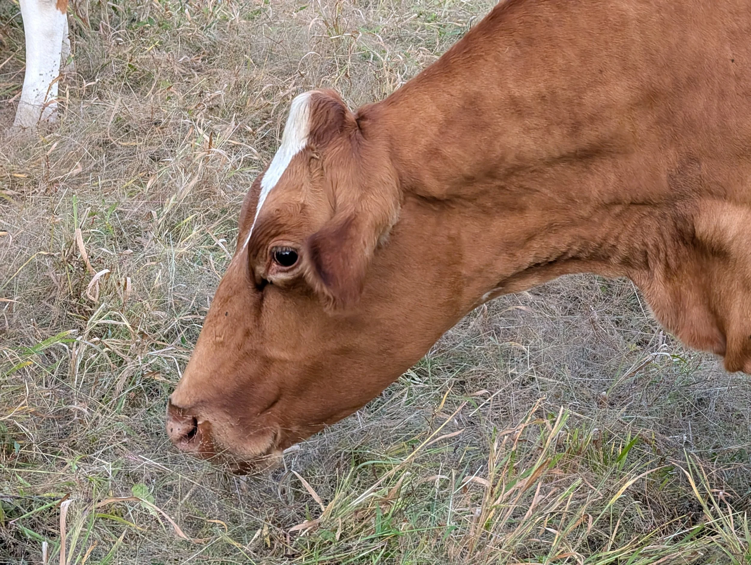 Perhaps a distant cousin of Kṛṣṇa and Balarām, Chintamani followed them from the same farm to ours in the Spring of 2023. It took her time to find her place in the herd and transition to the grass based diet here. Now she is a full-fledged herd member. She is so soft and gentle and her gaze will melt your heart!