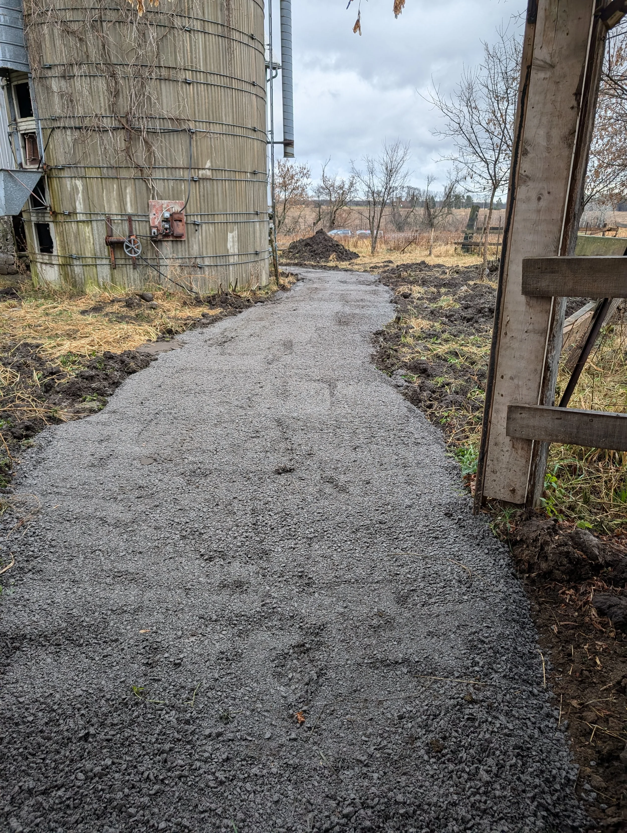 Although we feel very fortunate to have such a large and comfortable space for the cows and bulls to lounge and access their feed, some improvements are needed. The path between the lounge and barn is susceptible to becoming muddy and freezing unevenly, making the passage difficult to traverse. The feed area is adequate but older divider walls are prone to breaking from the force of the bulls and need redesigning to reduce hay waste.